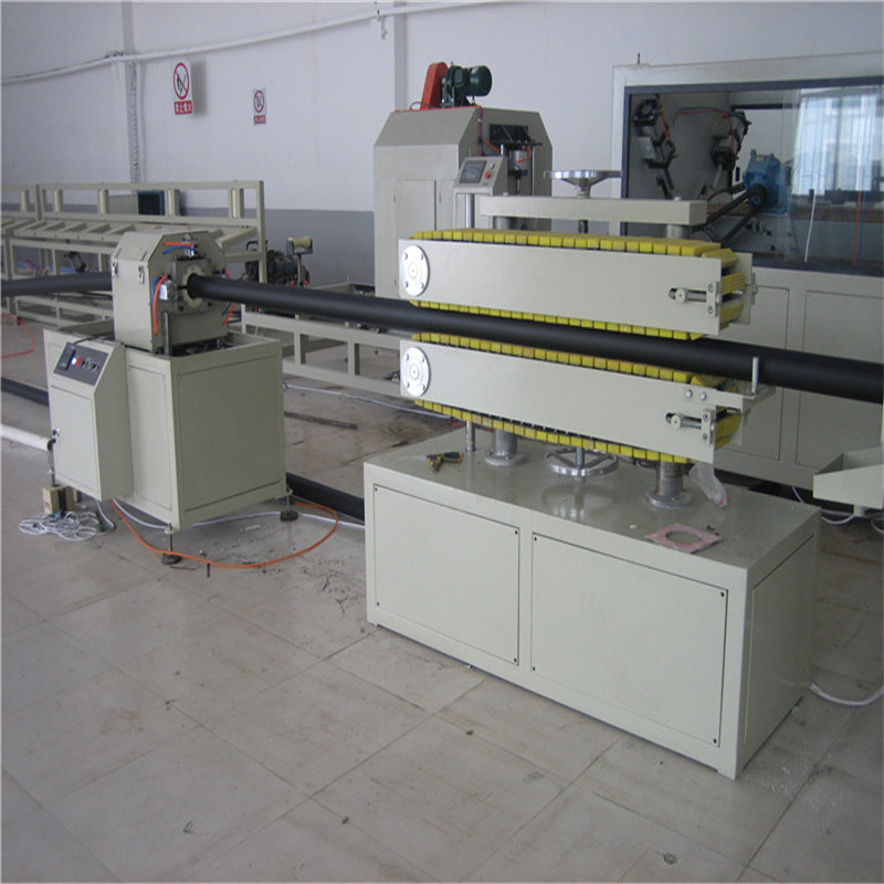 This production line mainly produces the large diameter MDPE/HDPE pipe. This kind of pipe has heat-resisting, bears the aging, the mechanical strength high, to bear the environment stress dehiscence, the anti creep to be able good and so on merits, is the city border transports the fuel gas and the urban water supply pipeline first choice product. Production line characteristic: Highly effective extruding machine: Matches take longchangjie engineer as the PE pipe design not the equal-space undulation screw rod, the forced cooling reversion spiral groove feeding section, matches by the high speed low noise hard tooth face decelerator, the output is high, the material melts warm low, the energy conservation effect is good. Screw divergence type compound nose: The guarantee melts the body pressure, the current capacity does not have the fluctuation evenly, the product is dense, the surface is smooth, does not have the flow marking. The vacuum decides the diameter and the cooling system: Uses the beat to decide the diameter wrap, the water trough uses the stainless steel. Cutting: May cut the heavy-caliber thick wall pipe.